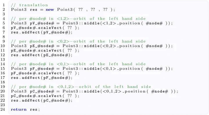 Implementing geometric modeling operations in a programming language can be inherently challenging despite their seemingly simple input-to-output descriptions. We propose a program synthesis method to generate executable code from representative examples. We focus on geometric computations in topology-based modeling, where nD objects are decomposed into cells with added geometric information. This domain uses combinatorial structures represented as graphs, with operations formalized as graph transformation rules and geometric modifications given by code-like annotations on the rule’s graph nodes.